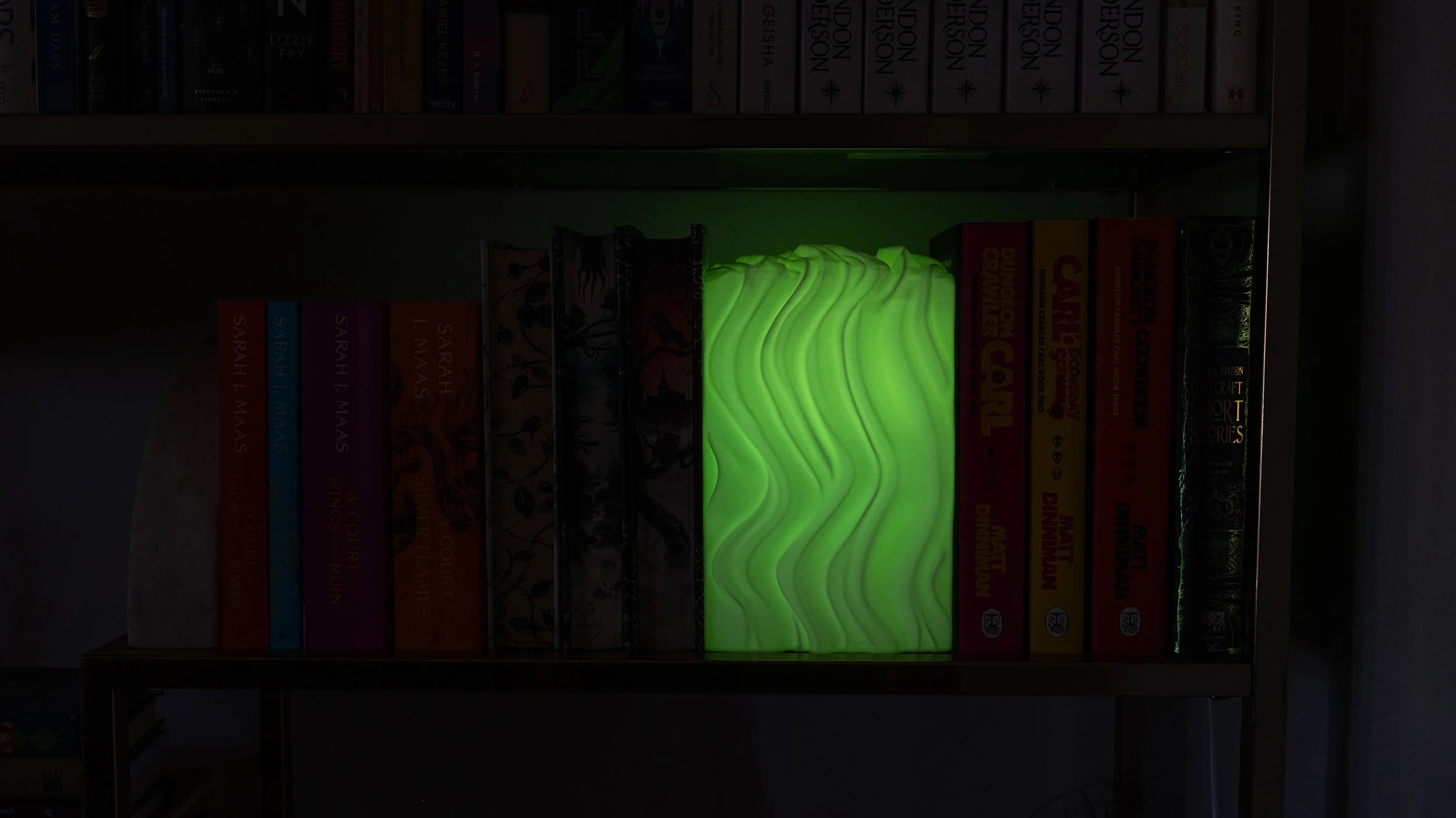 It’s layered contours create depth like stacked pages and shifting spines, catching shadow as you move past. The light stays soft and diffused, so it adds atmosphere without glare: perfect for winding down, late-night browsing, or giving a shelf that “finished” look.